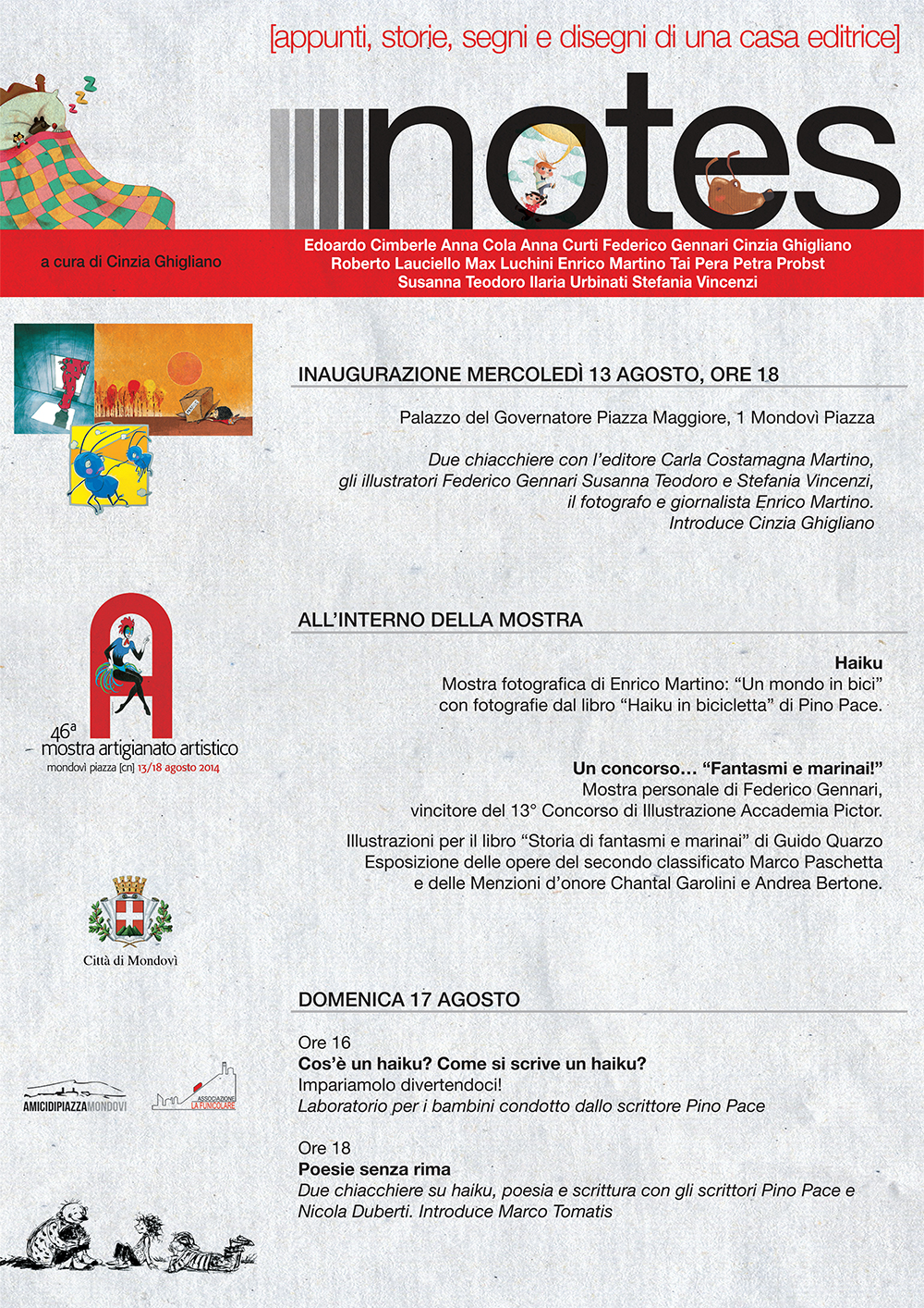 Inaugurazione : 13 agosto ore 18 Palazzo del Governatore - Piazza Maggiore 1 – Mondovì Piazza Due chiacchiere con l'editore Carla Costamagna Martino, gli illustratori Federico Gennari, Susanna Teodoro e Stefania Vincenzi, il fotografo e giornalista Enrico Martino. Introduce Cinzia Ghigliano. Domenica 17 agosto ore 16 Cos'è un haiku? Come si scrive un haiku? Domenica 17 agosto ore 18 Poesie senza rima. Per maggiori dettagli, scarica la locandina!